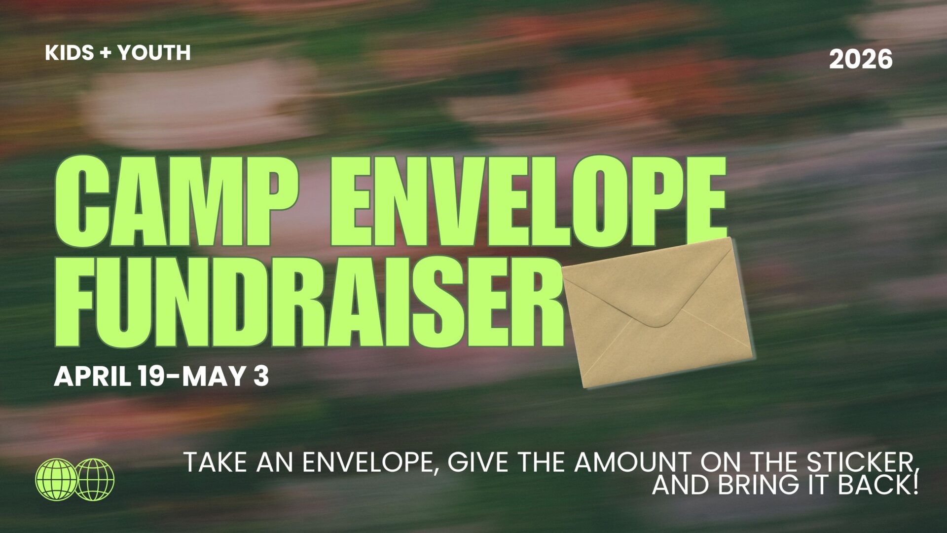 It’s that time of year again! Next Gen Camps are around the corner, and our annual Kids and Youth Envelope Fundraiser is here! The concept is simple, take an envelope, pay the amount on the sticker and put it back in the envelope, then return it to the table in the lobby! Guess what! You can also skip the envelope and give online by clicking the link below!